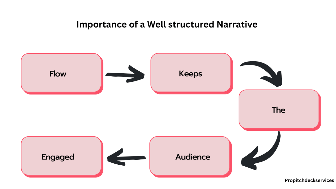 Example Explanation: A strong narrative structure ensures the audience can easily follow the story without feeling lost or overwhelmed. For instance, the pitch might start with an engaging hook (e.g., a powerful statistic about the problem), build through key details like market opportunity and traction, and conclude with a clear, compelling call to action. A poorly structured deck, on the other hand, might jump erratically between topics, making it hard for the audience to follow the argument.