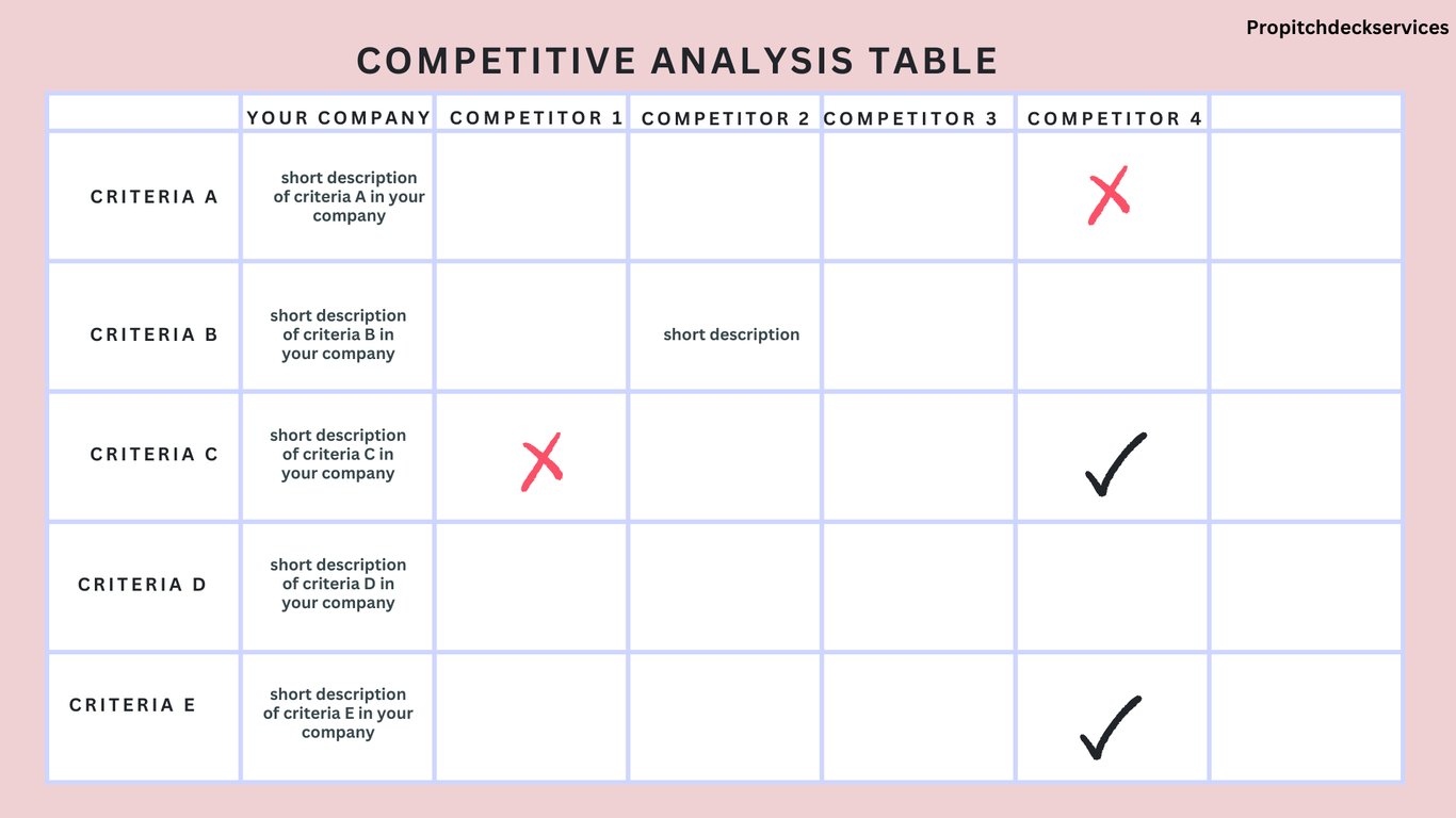 Bad Example: The same fintech startup vaguely claims, “We have the best technology,” without providing evidence or specifics. Competitors are not mentioned, and the deck does not explain how its technology is better or why it would be hard for others to replicate. This lack of detail leaves investors questioning the company’s market position and defensibility.