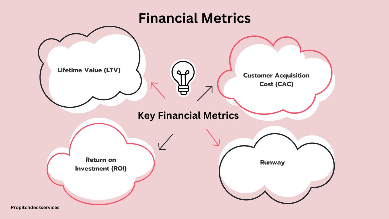 What It Is: The presentation of revenue forecasts, expenses, and key financial metrics like CAC (Customer Acquisition Cost), LTV (Lifetime Value), and ROI (Return on Investment).