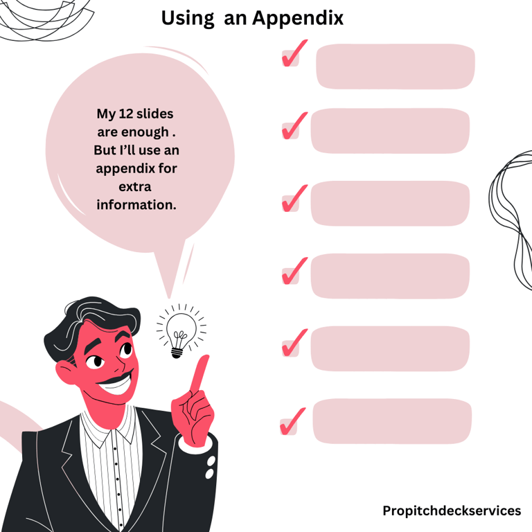 Example Explanation: A compelling pitch deck balances brevity with detail, ensuring that each slide adds value to the presentation. For example, an investor pitch should typically be 10–15 slides covering the essentials: problem, solution, market opportunity, team, financials, and call to action. Any extra information, like detailed financials or product specs, can be included in an appendix to keep the core presentation concise.