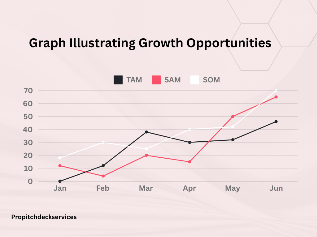 Best Scenario: The deck presents data-backed visuals (e.g., charts, graphs) showing the total addressable market (TAM), serviceable addressable market (SAM), and serviceable obtainable market (SOM). Growth opportunities are realistic and aligned with the product’s value proposition.