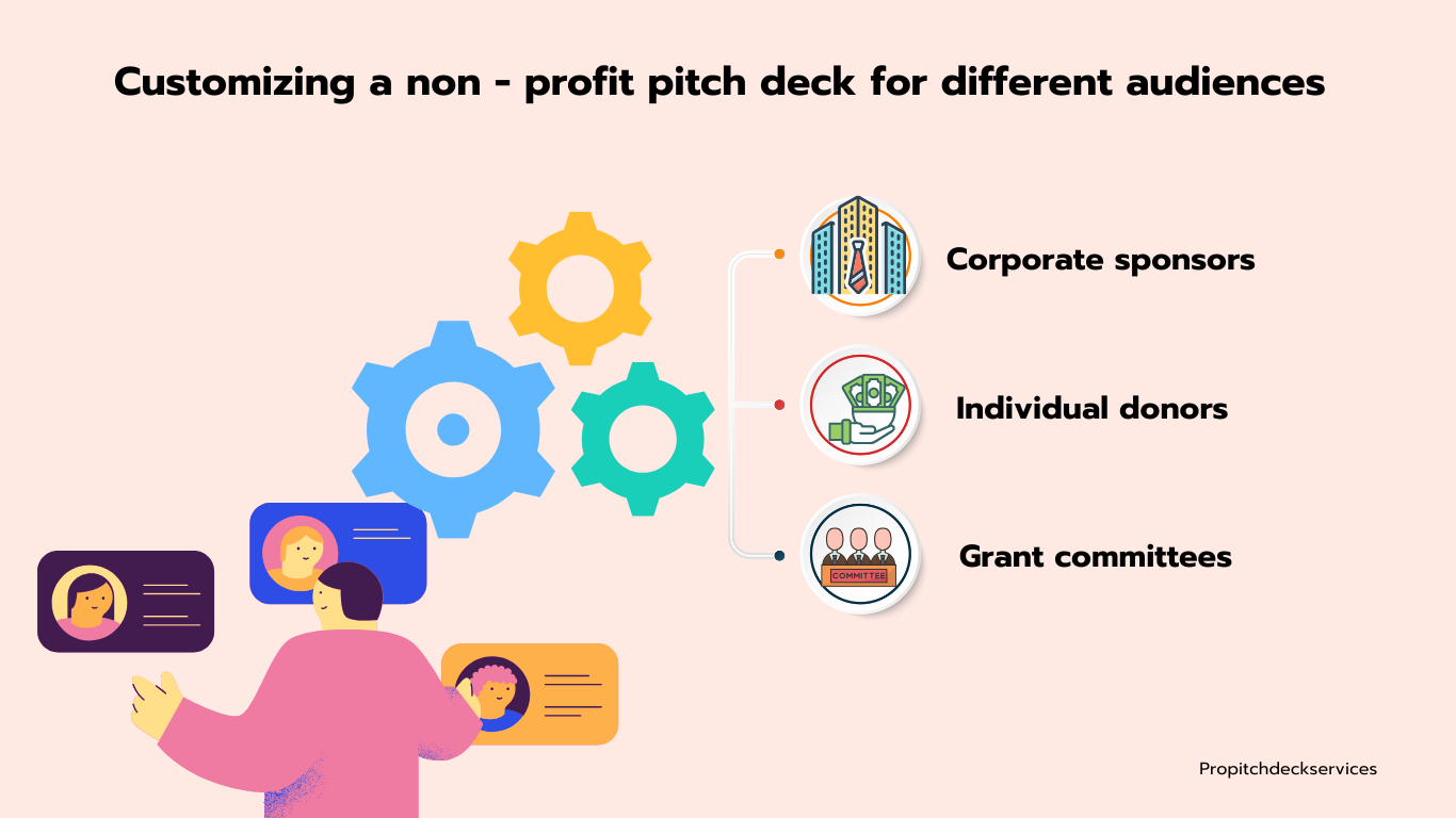Key audiences: A non-profit pitch deck targets corporate sponsors, grant committees, major donors, foundations, and board members as its primary recipients. Each type of audience seeks for different things.