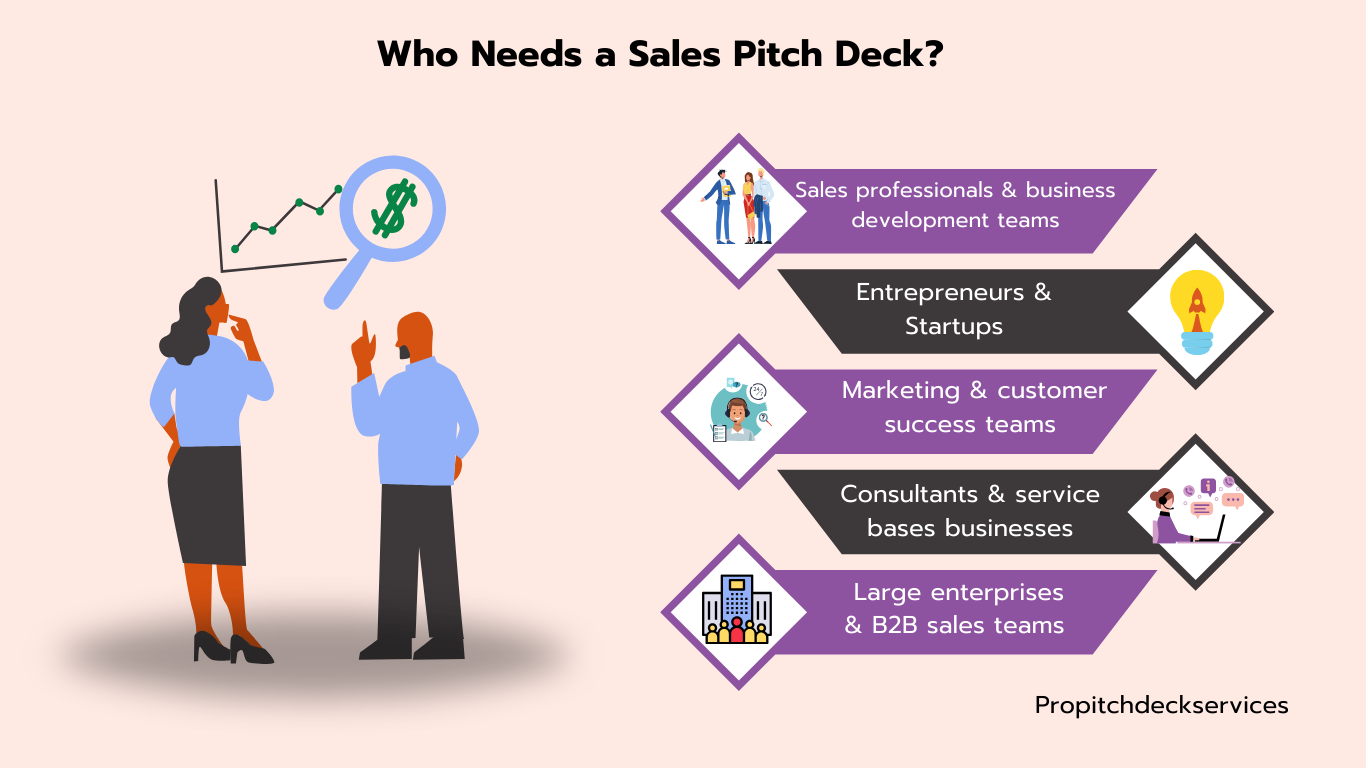 Sales pitch decks aren't just for traditional sales teams, they're used by various professionals across industries. Here are examples of the professionals that benefit from having a well-crafted sales pitch deck: