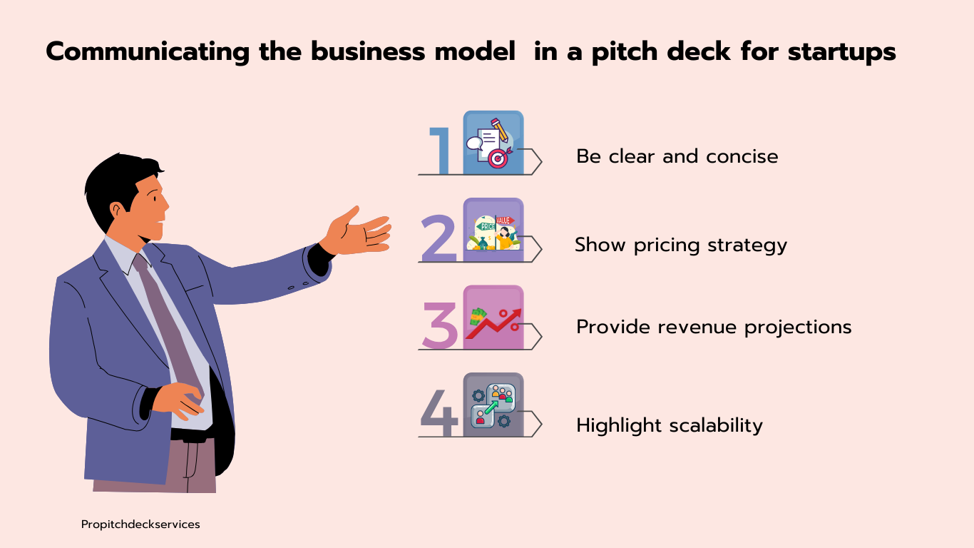 - Be clear and concise – Explain how the company makes money in one or two sentences to ensure investors quickly grasp the model.
