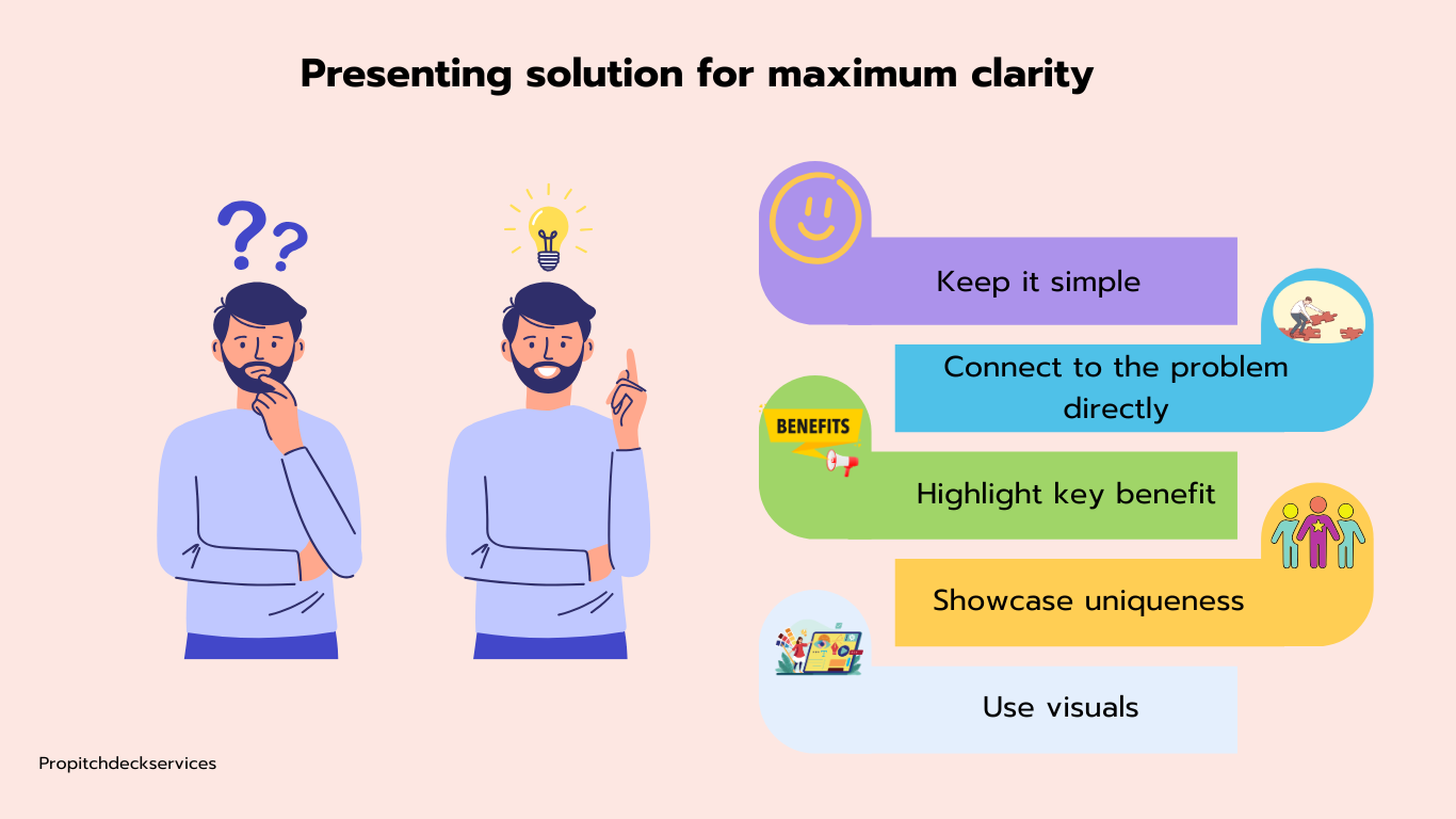 A compelling solution slide reassures investors that the startup has a clear, practical, and scalable way to solve a significant problem.