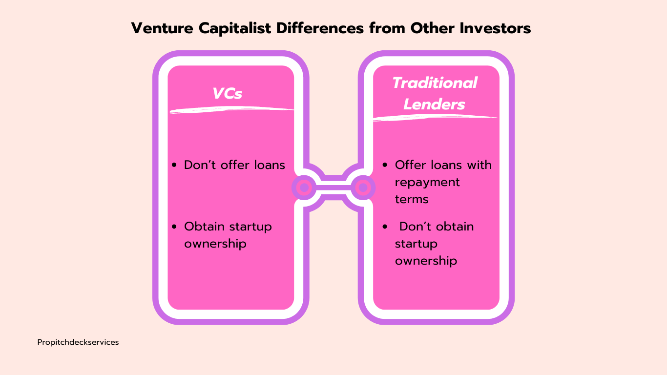 Venture capitalists' funding structures differ from those of banks and traditional lenders because they do not offer loans with repayment terms. As part of their funding exchange, venture capitalists obtain startup ownership while accepting the consequences of market failure. Startups prefer VC funding over bank loans because it provides capital, mentorship, strategic guidance, and industry connections—essential for scaling a business.
