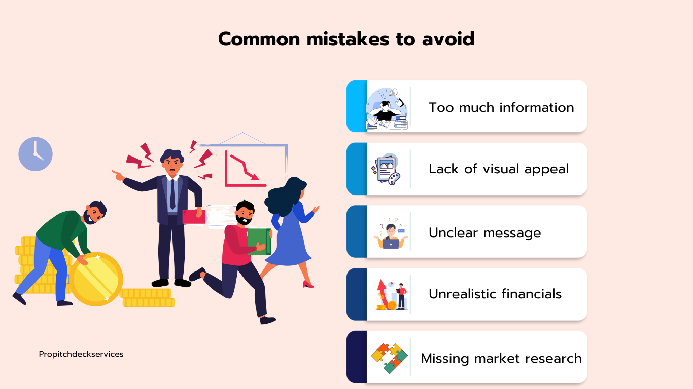 Too much information: Avoid overwhelming your audience with unnecessary details. Keep your pitch deck clear and concise.