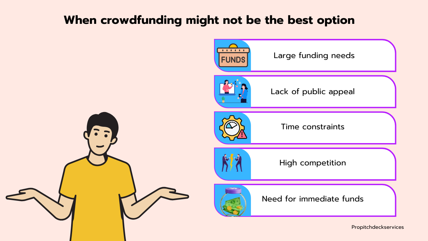 - Large funding needs: If your project requires significant capital, crowdfunding might not be the best option.