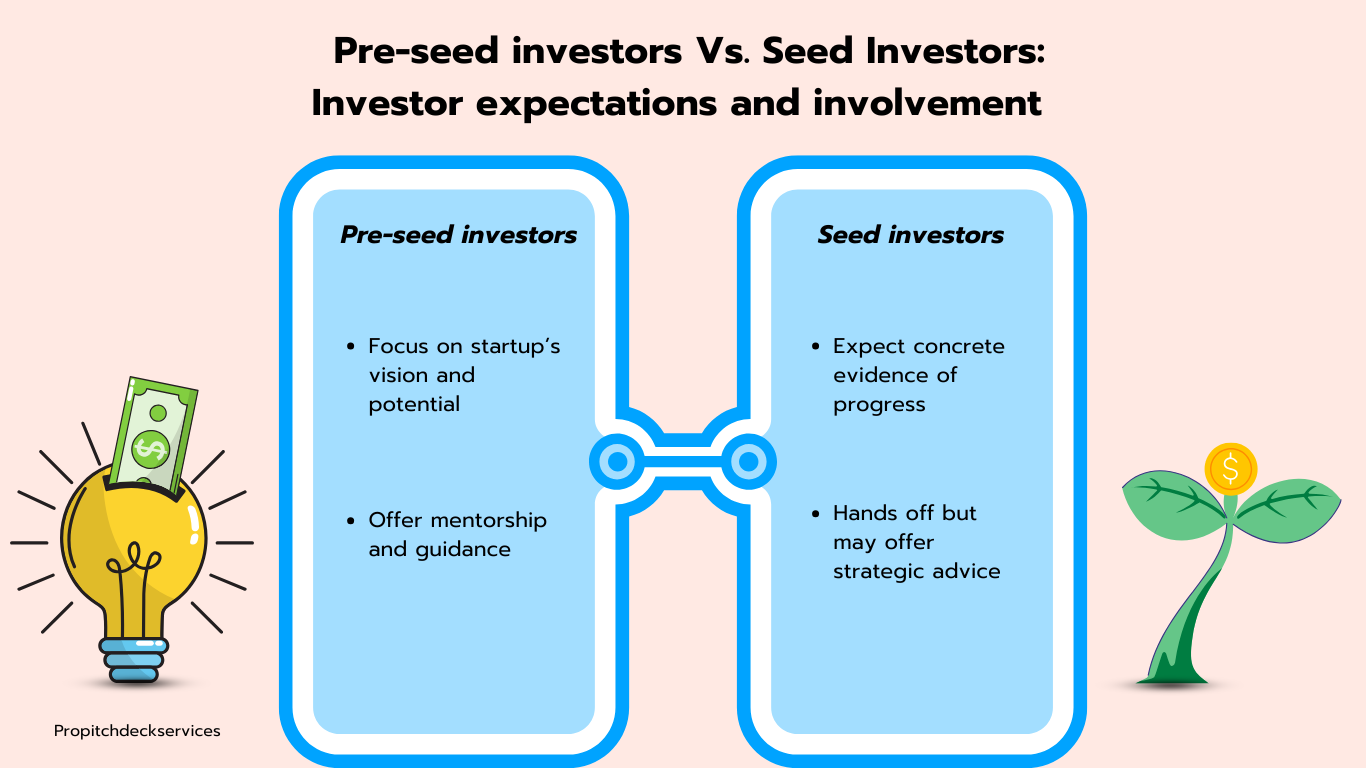- Pre-seed investors are often more focused on the startup's vision and potential. They may expect to see a strong idea and some form of validation, even if the product isn't fully developed yet. Given that the business is in its infancy, these investors are typically more involved in offering mentorship and guidance.