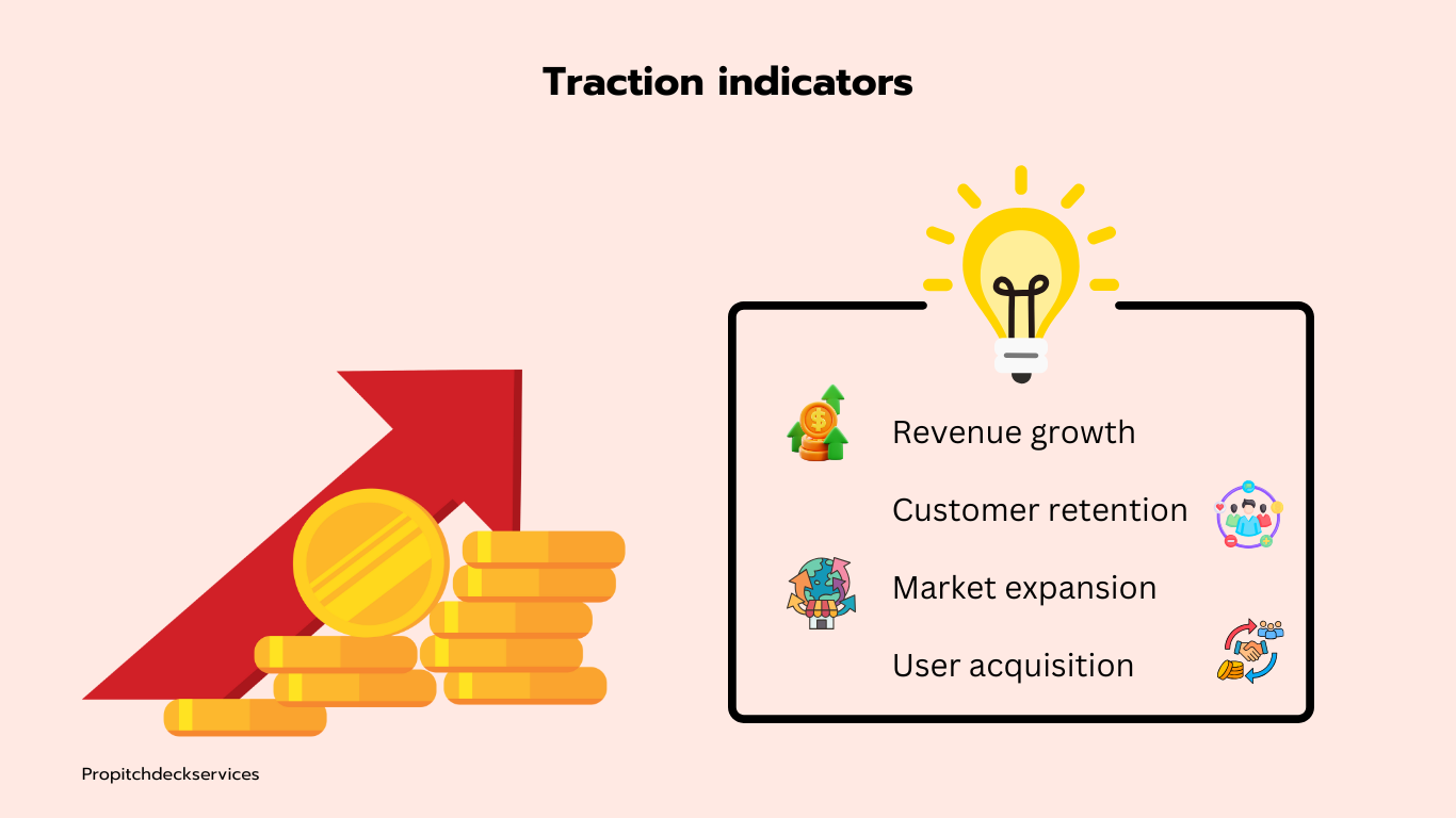 - Traction metrics – Showcase customer growth, partnerships, and financial performance7.