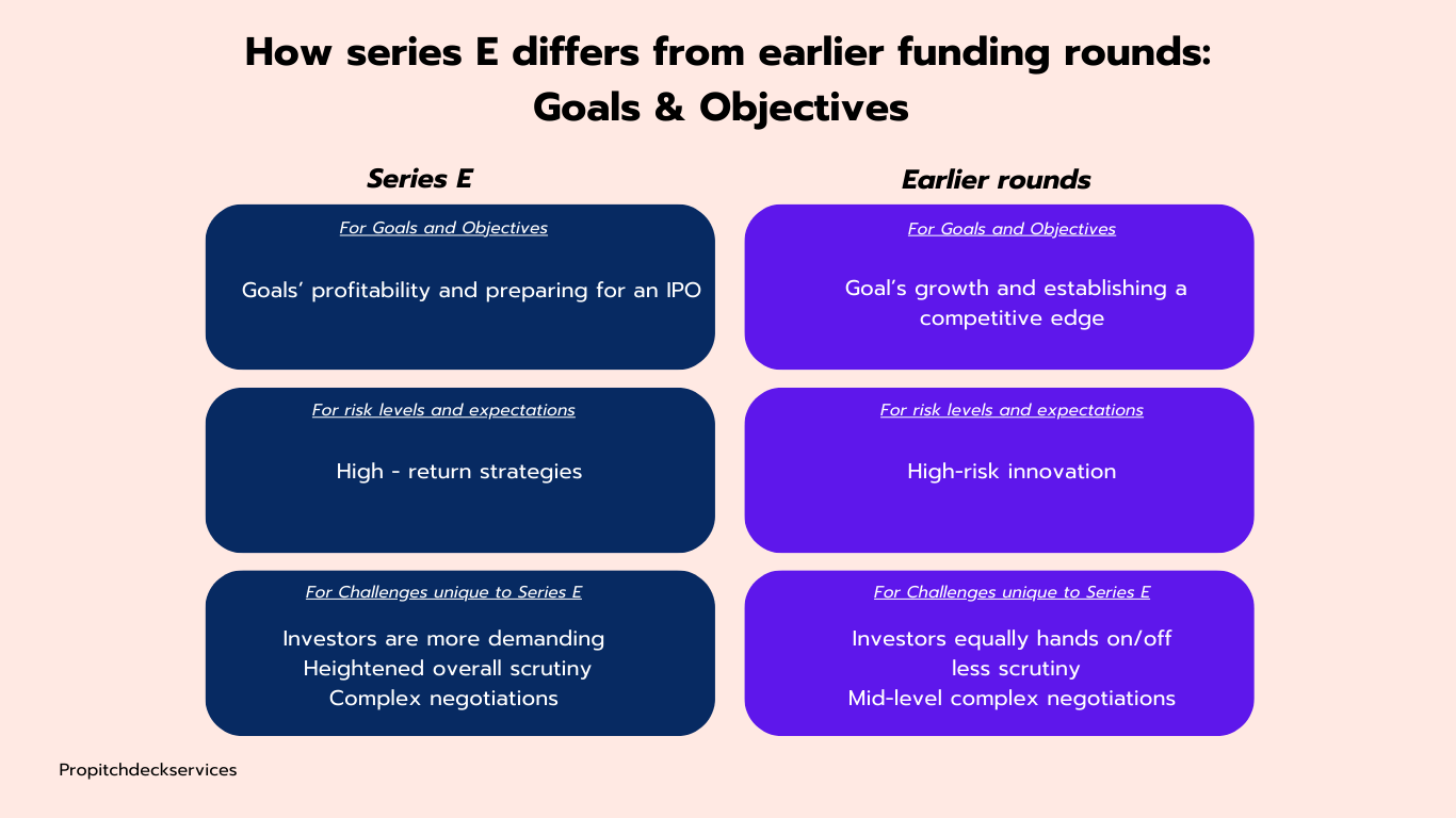 The company's focus is the primary difference between Series E funding and earlier rounds. While earlier rounds concern growth and establishing a competitive edge, Series E is more about achieving profitability and preparing for an IPO1. Investors at this stage are looking for established companies with proven business models and clear paths to leadership in their market.