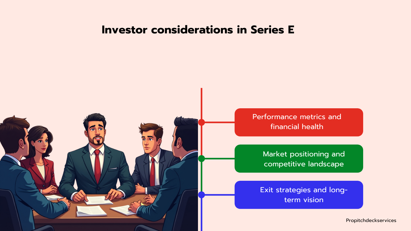 Investors at the Series E investment stage focus on key performance metrics. They seek companies with a solid financial foundation, consistent revenue growth, and clear profit projections3. Demonstrating financial health through strong metrics such as EBITDA is essential to attracting the right investors.