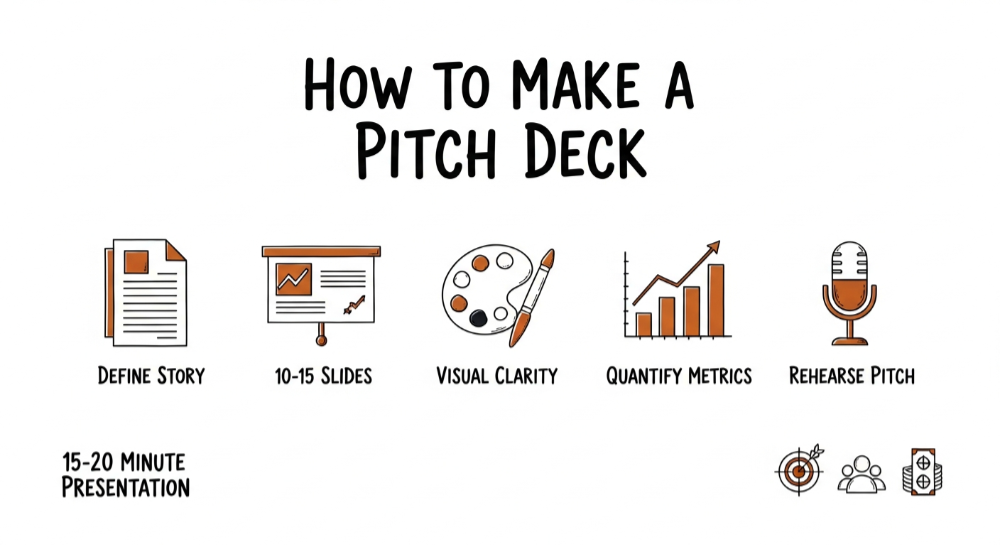 To make a pitch deck, start by defining your core narrative, then create 10-15 slides that cover your problem, solution, market opportunity, business model, traction, team, and funding requirements using presentation software like PowerPoint, Keynote, or Google Slides.