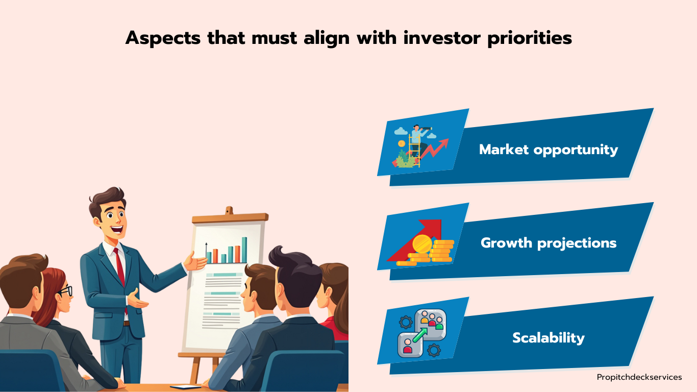A pitch deck should be well prepared so that the market opportunity, scalability, and realistic growth projections align with investor priorities6. Integrating these insights allows founders to present a definite case for investment by that investor.