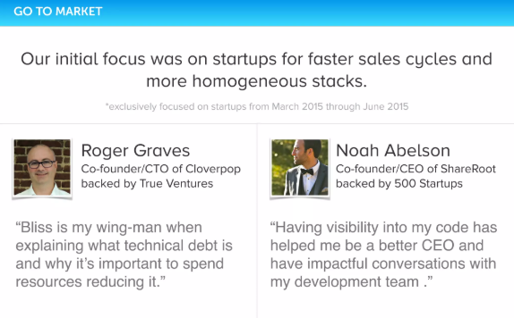 Includes testimonials from startup founders backed by well-known investors (True Ventures and 500 Startups), reinforcing trust and validating the product's value.