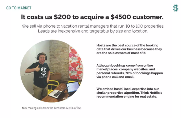 It focuses on vacation rental managers handling 10 to 100 properties, showing precise segmentation. It shows how sales staff can talk to leads for less money while aiming at specific markets through phone calls.