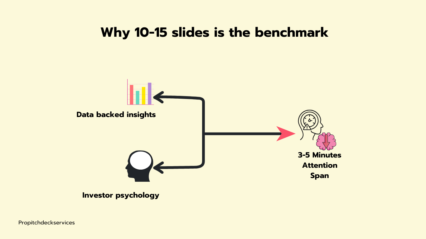 - The balance between detail and engagement: Too much information can overwhelm investors, while too little leaves them with unanswered questions. A 10-15 slide pitch deck strikes the perfect balance by covering the essential points while maintaining engagement.