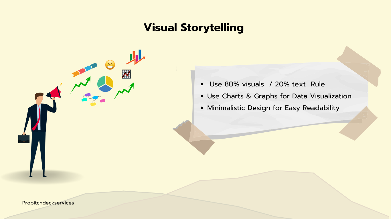Design your slide so that 80% of the content is visual (charts, graphics, or images) and only 20% is text. This will ensure that your pitch deck is engaging and easy to follow.