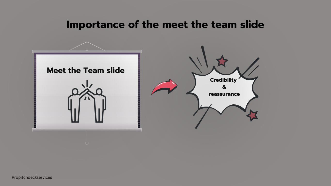 The Meet the Team slide is one of the main pitch deck slides, and investors use it to assess a startup's capability and credibility. It is critical because a startup's execution ability largely depends on its leadership team's strength, experience, and chemistry.
