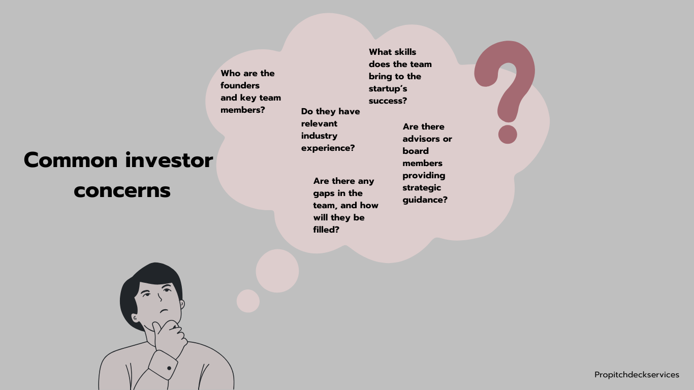 A transparent and well-structured team slide is one of the most effective tools for winning investor trust. Investors often scrutinize the team slide to identify potential risks or weaknesses. Addressing these concerns proactively can build trust and reduce objections:
