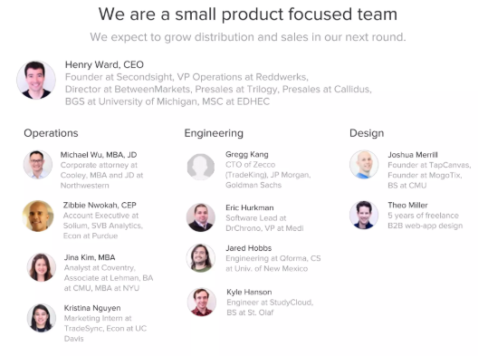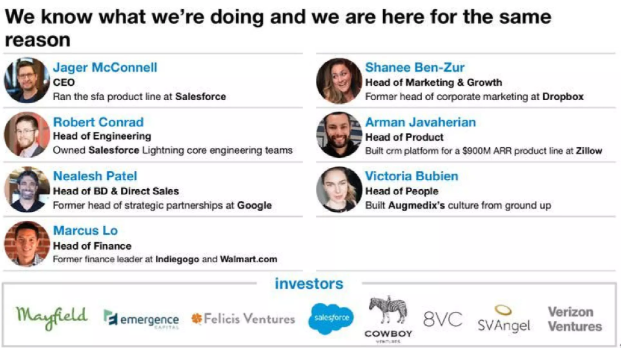 For example, as shown here, in Crunch base, Jager McConnell – CEO, Ran the SFA product line at Salesforce.