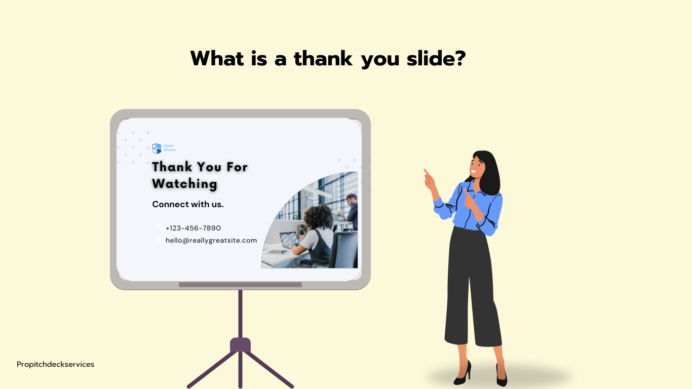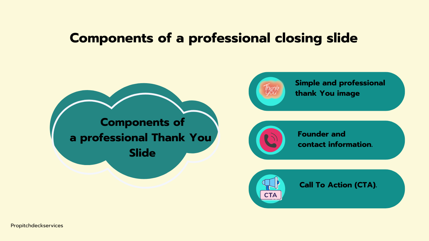 A well-crafted thank you slide, or closing slide, ensures your pitch leaves a lasting impression on investors. It should be simple, clear, and actionable while reinforcing professionalism and credibility.