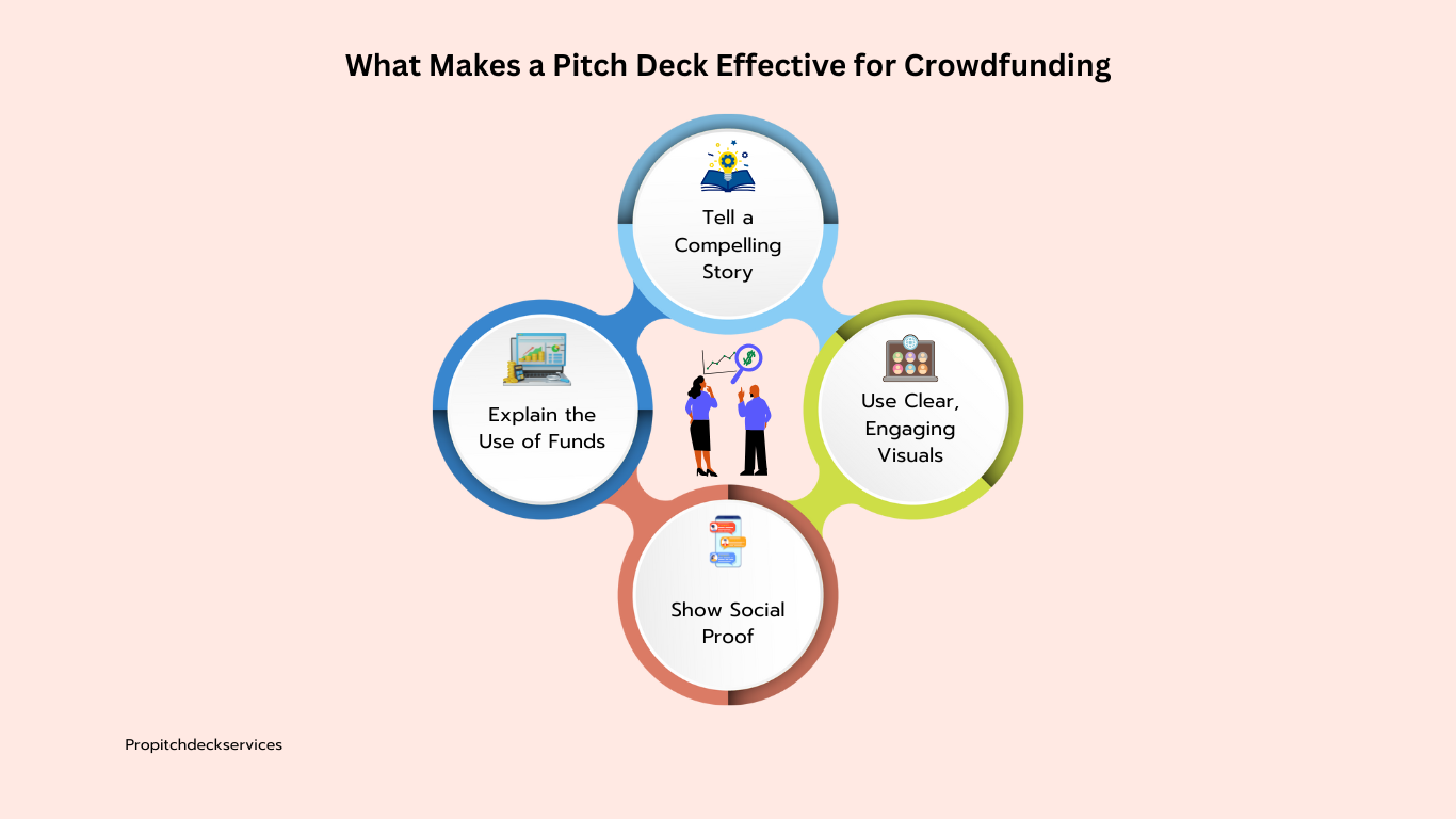 Unlike traditional investors for a business, crowdfunding backers need simple, engaging storytelling and strong visuals to capture their interest quickly. A successful crowdfunding pitch deck should: