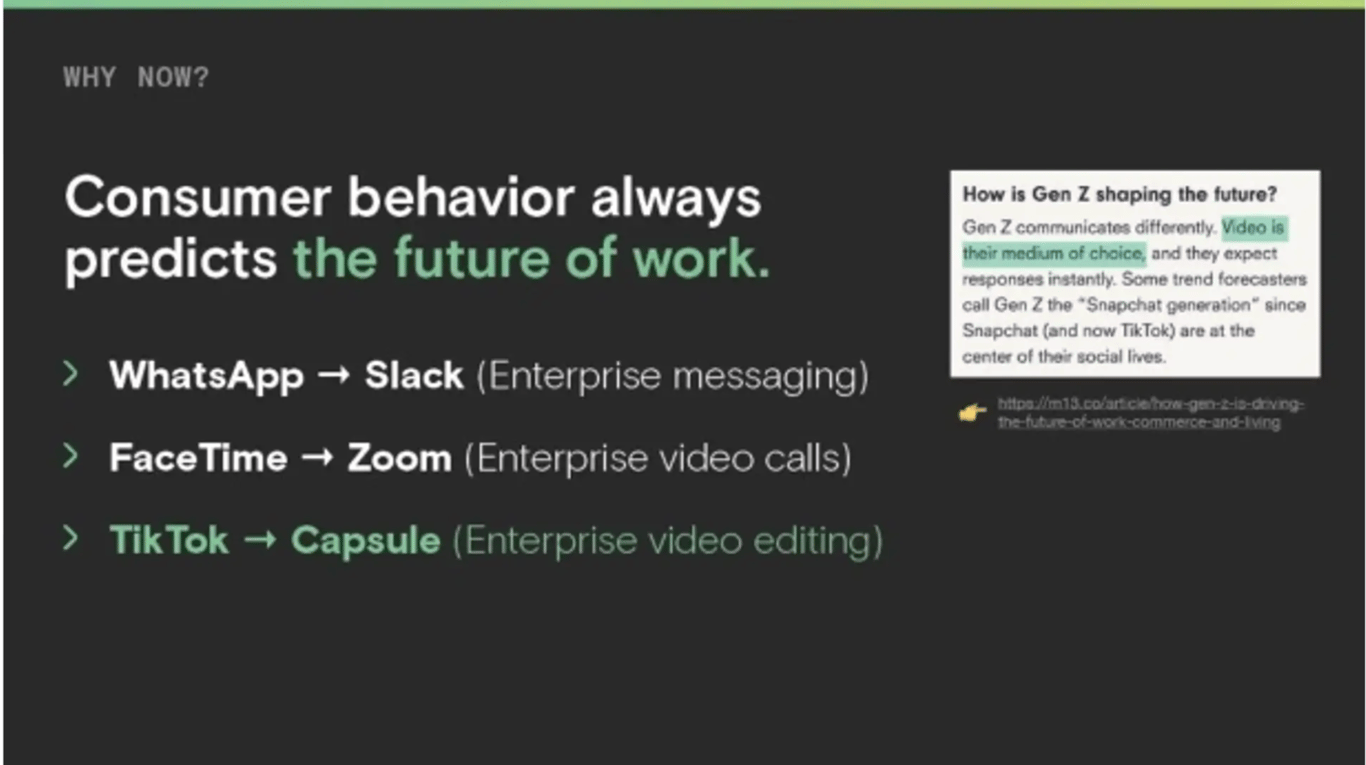 Real-world examples of successful "why now" narratives demonstrate how startups effectively communicate market timing. Capsule, an enterprise video editing platform, presented a compelling "why now" slide that leveraged consumer behavior trends. The slide stated: "Consumer behavior always predicts the future of work" and drew clear parallels: