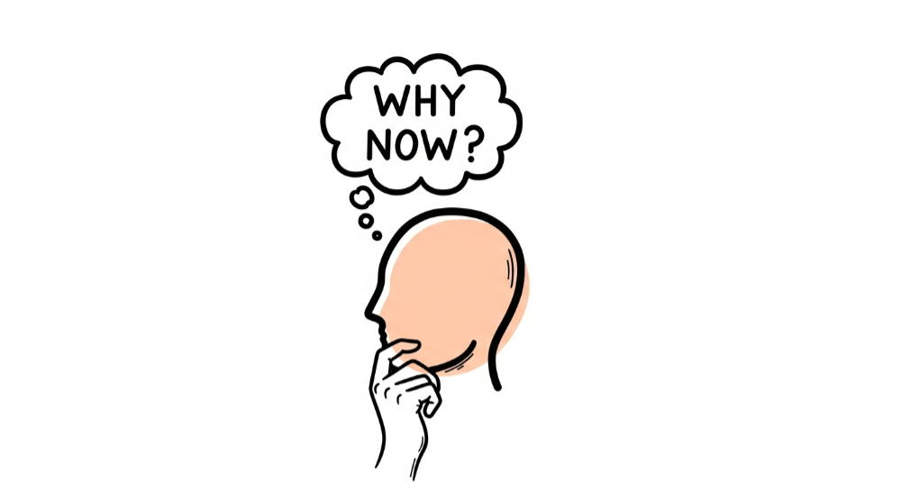The why now slide addresses the specific problem of market timing and opportunity validation. The slide demonstrates to investors that external conditions have aligned to create a unique window for the solution to succeed. The slide identifies market trends, technological shifts, behavioral changes, and competitive gaps that make the current moment optimal for launching and scaling the business.